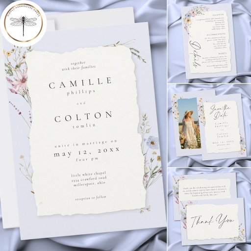 This dusty blue floral wedding photo save the date card features a soft pastel background, delicate wildflowers, and a handmade torn edge paper look. Perfect for romantic garden weddings, it offers an elegant, modern style with timeless charm for couples seeking a refined wedding design. Created by Simply Farmhouse Press.