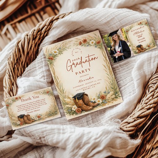 Celebrate your graduate with a warm western-inspired design featuring classic cowgirl boots, delicate wildflowers, and soft prairie grasses framing the layout. The earthy neutral palette of beige, sage, dusty blue, and warm terracotta creates a refined ranch aesthetic that feels both modern and timeless. Perfect for country-loving grads, rodeo girls, or anyone who dreams bigger under open skies. A beautiful blend of rustic charm and elegant botanical detail for a memorable graduation celebration.
