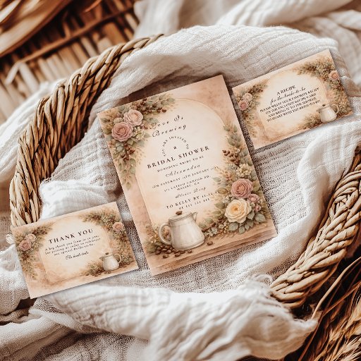 Warm, cozy, and beautifully romantic, this coffee-inspired bridal shower design blends soft blush roses, rich espresso tones, and delicate autumn botanicals over a vintage parchment background. A charming coffee cup detail and scattered beans create the perfect “Love Is Brewing” atmosphere for a brunch celebration, café gathering, or fall bridal shower. The elegant typography keeps the look refined while the warm earthy palette adds an inviting, intimate feel. A lovely choice for coffee lovers, fall brides, and cozy-chic celebrations.