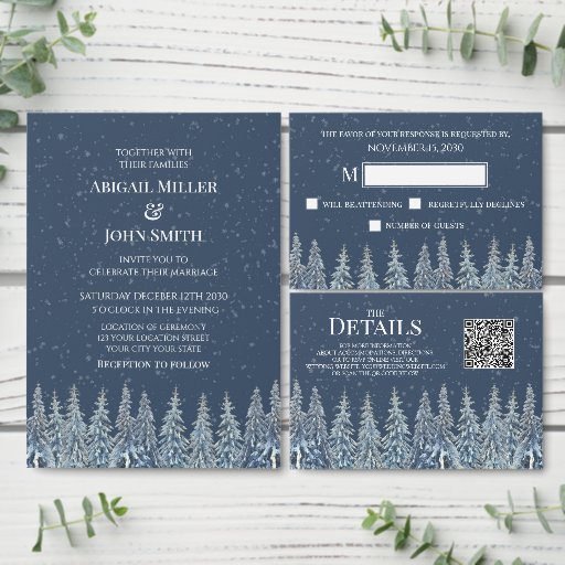 An elegant wedding day congratulations card for your daughter and son in law with a rustic snow covered winter forest in navy blue and white.