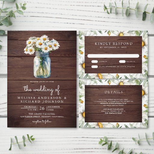 Rustic Wood Daisies Floral Wedding 出欠カード