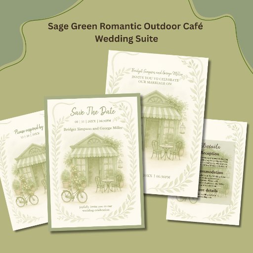 This sage green wedding menu and program all in one card captures the romantic atmosphere of a cozy garden café, framed by soft botanical details and vintage charm. The gentle sage tones bring a sense of calm, elegance, and timeless beauty, making it ideal for couples who dream of a wedding inspired by nature, outdoor venues, or rustic courtyard settings. The delicate bicycle with flowers, leafy border, and charming café backdrop create a warm and welcoming scene that feels both intimate and refined.