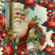 Vintage illustration of Santa Claus bringing gifts and presents for Christmas, decorated with holly berries and poinsettias. Text inside: Merry Christmas & Happy New Year. Personalize by adding your own text.