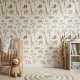 Bring the magic of the savanna to a child's space with this charming all-over wallpaper. The pattern features friendly, stylized safari animals, including the lion, giraffe, elephant, zebra, and hippo, playfully arranged alongside acacia trees and a rising sun. The soft, neutral color palette and creamy background create a light, cheerful, and gender-neutral environment. Perfect for an accent wall or an entire room to encourage imagination and happy dreams. Search ID1259 to see other products with this cute safari pattern. Note: design adapted from generative content.