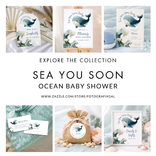 Sea You Soon Whale Ocean Baby Shower white. Available digitally and printed. Easily personalise the text to your details. With a watercolor illustration of a whale and wave.