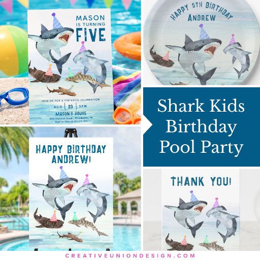 Enjoy birthday cake and ice cream with all your favorite sharks! This paper plates design features a school of festive birthday sharks all wearing fun party hats! Easily edit with your birthday party information.