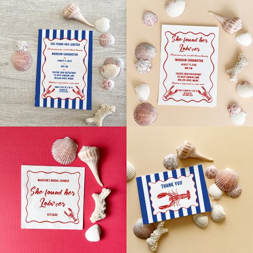 Create custom party favors with a nautical style. These mini champagne bottle labels are perfect for giving your guests something to celebrate. The labels are ready to be personalized with all of your custom text. The "She Found Her Lobster" headline is perfect for bridal showers but can be customized with your own message. This design features my realistic style hand drawn illustration of a lobster in red with your text in blue. The graphic and text are set inside a wavy scalloped frame against a blue and white striped background for a nautical look.