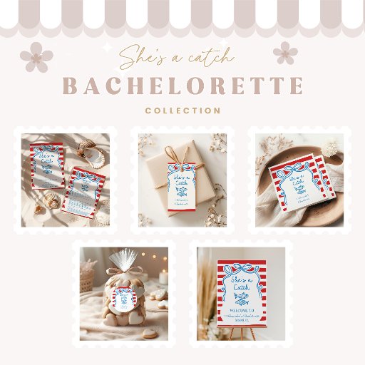 Reel in the fun with this quirky coastal design featuring bold red stripes, playful hand-drawn fish, and a big bow that says "party ready." Perfect for a seaside send-off, seafood soirée, or beach weekend with the girls. Fully editable to fit your plans—whether it's Miami or Margaritaville.