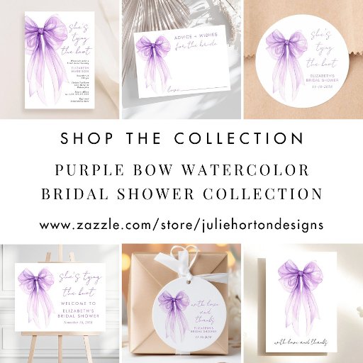 Elegant bridal shower sparkling wine labels featuring a purple bow watercolor, "she's tying the knot" showcased in a chic script, and the bride's name and the shower date.