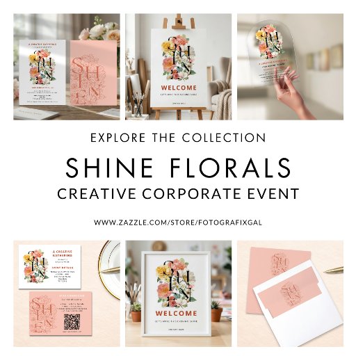 SHINE Floral Creative Studio Name Corporate. This elegant event design features the fixed headline word “SHINE” layered within a lush, painterly floral arrangement for a bold yet refined statement. Perfect for your team to wear at creative gatherings, studio launches, brand events, networking evenings, leadership conferences, and inspirational workshops. The central word “SHINE” is part of the artwork and not editable.
