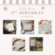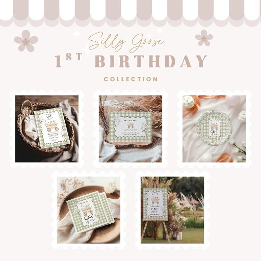 Celebrate your little one's big day with this silly goose first birthday invitation, featuring a sweet trio of whimsical geese surrounded by soft white florals, a birthday hat, and pastel gift boxes. The muted green striped background adds a fresh, minimalist touch while keeping things playfully rustic. Ideal for cottagecore, coquette, or storybook-themed baby girl birthdays. Personalize the editable text to match your party details.