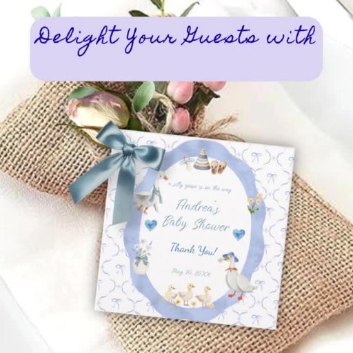 Honk! A silly baby goose is on the way! Get ready to waddle into a delightful celebration with this charming "Silly Goose" baby shower theme. This thank you card is a perfect way to say thank you to your guests for all the love they have showered on you and your little boy. It features hand painted blue bows, flowers, hearts, baby bottle, pacifier, stacking toy and mom, dad and baby geese too. Easily change the details to your own and if you would like to, edit the font style, color, size and placement.