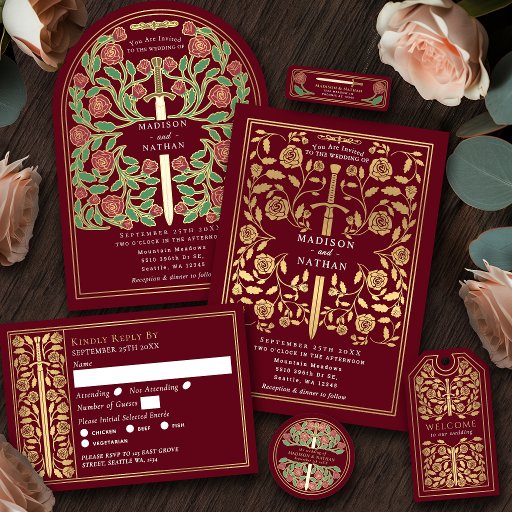 Celebrate your special day with these Royal Medieval Sword Wedding RSVP Cards against a red background. You can customize this further by clicking on the "PERSONALIZE" button. PLEASE NOTE: The silver on this item is NOT real foil and is printed in flat colors
