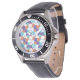 Silver watch with a colorful geometric mosaic dial, featuring a black bezel with white numbers. Black leather strap with white stitching. Elegant style.