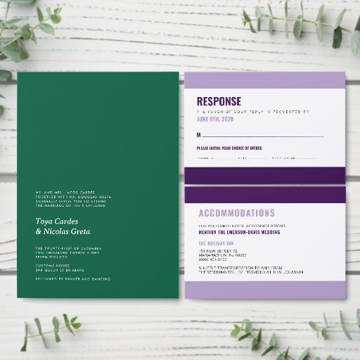 This response card uses arched text to create a dynamic layout. Modern and timeless fonts are paired together to create a unique look.