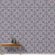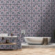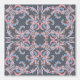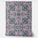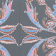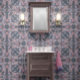 Refined slate blue-grey background with intricate pastel baroque scrolls.