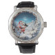 A picturesque winter illustration featuring Santa Claus waving, standing in a snow-covered village nestled among towering mountains under a crescent moon and starry sky. Quaint cottages and snow-laden evergreen trees complete the serene landscape. The artwork is presented on a round, silver-toned item with numerical markings around its edge, capturing a tranquil and inviting Christmas atmosphere.