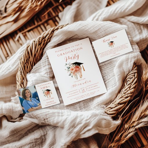 Celebrate your milestone in a beautifully feminine way with this soft floral tooth graduation design. A delicate watercolor tooth wearing a graduation cap is surrounded by blush florals and warm neutral tones, creating a gentle and elegant aesthetic. The layout is clean, modern, and easy to personalize for your event details. Perfect for dental school graduation celebrations, hygiene programs, or anyone who wants a stylish, professional, and pretty graduation theme.