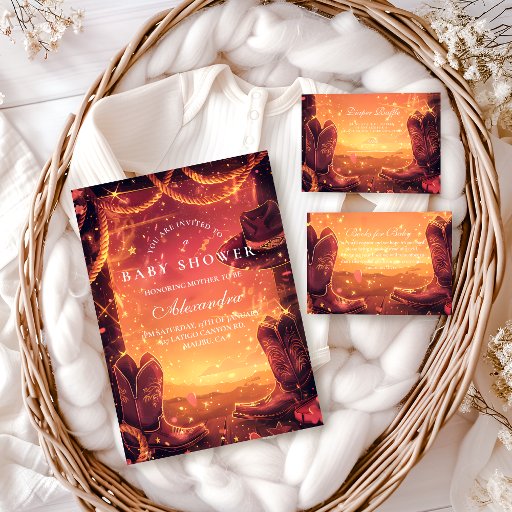 Celebrate your little one with a rustic western baby shower set in soft desert tones. This design features cowboy boots, lasso ropes, and wildflowers under a dreamy painted sky. Perfect for country, boho, or rustic-themed baby showers with a cozy western charm.