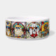 A dog bowl featuring ten stained glass depictions of small dogs. From left to right, they are Shih Tzu, Yorkie, Chihuahua, Welsh Corgi, Pomeranian, toy poodle, Dachshund, Lhasa Arso, Boston Terrier, and a pug.