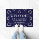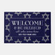 Star of スタイリッシュ David WELCOME Door Mat with the WELCOME & BE 賛美 ALL WHO ENTER HERE (EXCEPT TRAPPASSERS).背景はダビデフェイクィの銀の星で、背景は真夜中の青。すべての文字はカスタマイズ可能で、例えば家族の名前、家族のモットー、引用文を追加する必要に応じて用語を修正でき感動的る。ハヌカ素晴らしーへの贈り物。