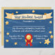 Star Student Award Certificate Award for Pre-school, Pre-K,幼稚園または任意のコースまたはプログラム。このカスタマイズ可能なキッズスクールアワード参加証明書に独自のタイトルと詳細を追加レターサイズ8.5"x11"。青カスタムい夜空、星、バナー、光と赤いリボンのシールの光と生成aiデザイン。幼稚園素晴らし、幼稚園、小学校の就学前に使う!このカスタマイズ可能な証明書を使用して、学生とスタッフの努力に関するプライドと熱意を示パーソナライズされたしなさい。自分の文字をオンラインで追加しカスタム、あなたの夏のキャンプ、余分なカリキュラム活動、数学、ステム、蒸気、科学、ロボット、エンジニアリング、または選択プログラムのために作られた証明書を注文する。後で離れ署名を追加する際には空白の、署名の領域を使用するか、名前とタイトルを入力して、上に署名を追加する。Honoreeの名前を入力するか、行を入力し空白のて後で黒や白のマ離れーカーを手で追加するか、印刷された名前を追加することができる。