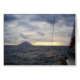 Stromboliの火山島に、小さいヨットで、劇的な空の下で近づきます。