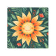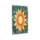 The image shows an illustration of a sunflower flower with a smiling face, surrounded by leaves and small flowers.