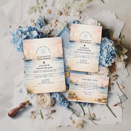 Sunset Sailboat Seaside Wedding 招待状