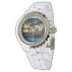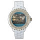 This captivating watch design, 'Swamp Angel,' features a serene yet impactful scene where an angel hovers protectively over a woman asleep in a rowboat. The boat is ensnared in brambles along a swampy riverbank, symbolizing life's entanglements and challenges. A direct horizontal beam of light from the sun connects to the angel's hand, then the light cascades vertically down to the sleeping woman, representing the flow of inspiration and hope, giving needed answers. The artwork beautifully evokes a sense of peace and guidance amidst turmoil.