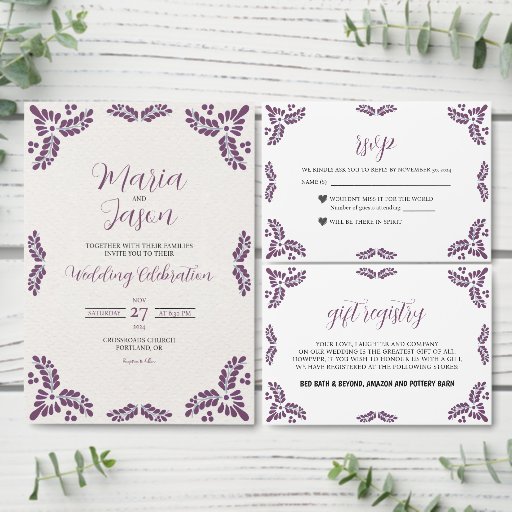 Talavera Purple Floral Minimalist Spanish Wedding 招待状