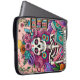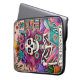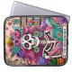 Vibrant, colorful design featuring a funny tarot card with a female skeleton. The skeleton has wild pink hair with flowers in it, a sugar skull face, and is holding a open book. The colorful text reads: "The bookworm". This design is available on a wide variety of products.