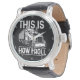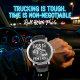 This bold wall clock humorously declares a truck driver's way of life. Against a black background with a vibrant green rim, it features a white illustration of a large semi-truck with its trailer. The prominent text "THIS IS HOW I ROLL" is displayed in distressed white lettering, making a confident and witty statement about the trucking profession.