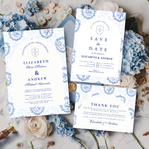 An elegant blue and white chinoiserie design inspired by classic Delft porcelain patterns. The intricate floral border surrounds a clean central panel, creating a refined and timeless look for sophisticated wedding celebrations. Delicate European toile-style artwork combined with crisp navy typography gives the design a heritage aesthetic reminiscent of fine porcelain and vintage stationery. Perfect for couples planning a classic blue and white wedding theme with traditional elegance.
