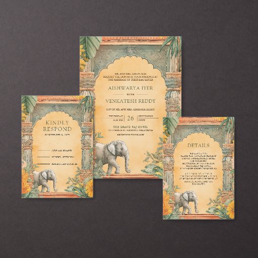 Amaze your guests with this elegant south Indian theme wedding save the date featuring beautiful traditional columns and vintage architectural elements decorated with marigold flowers and banana leaves. Simply add your event details on this easy-to-use template and adorn this card with your favorite photo to make it a one-of-a-kind save the date card.
