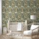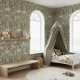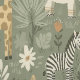 Create an immersive, magical safari environment with this charming all-over tribal safari jungle wallpaper. This pattern features the entire cast of friendly, stylized animals—including the lion, giraffe, zebra, elephant, rhino, and monkey—nestled among whimsical botanical elements. The rich olive-green background and muted, earthy tones ensure the design is both sophisticated and fun. Perfect for an accent wall or an entire room, this wallpaper creates a soothing, gender-neutral space that encourages imagination and exploration for any young child. Search ID1260 to see other products with this cute safari pattern. Note: design adapted from generative content.