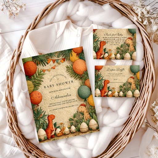 Step into a lush prehistoric paradise with this vintage-style dinosaur design. Featuring palm trees, ferns, and gentle dinosaurs in warm earthy tones, it’s perfect for a baby shower with adventure and charm. A timeless blend of tropical greenery and whimsical Jurassic nostalgia.