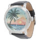 This artistic wall clock features a beautiful illustration of a palm tree silhouetted against a vibrant tropical sunset. The design captures a serene ocean with gentle waves under a colorful sky, evoking a relaxing summer beach landscape. This stylish and artistic timepiece is perfect for interior decor, bringing a calm and vibrant tropical theme to any room.