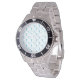 Two images of a silver wristwatch with a metallic band and a black bezel. The watch face has a light blue abstract pattern. The first image shows a front view, while the second displays it from an angle.