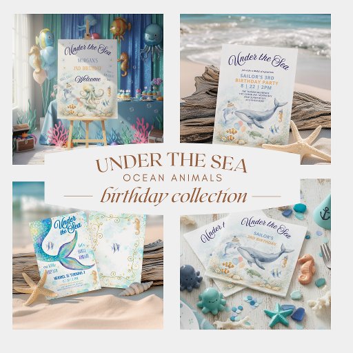 Add a splash of coastal charm to your celebration with these Under the Sea Ocean Animals Octopus birthday stickers, featuring an adorable octopus, a playful dolphin and a sweet seahorse in party hats, a friendly sea turtle, and tropical fish gathered around a coral reef. “Under the Sea” in nautical navy swirly script adds an enchanting nautical touch and you can personalize the name and birthday number. Perfect as envelope seals, party favor labels, gift stickers, or decorative accents for invitation mail and treat bags. Customize with your child's name and birthday number to tie together your beachy party theme. Art by KL Stock