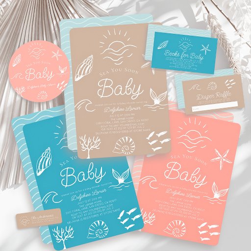This cute 'Sea You Soon Baby' gender-neutral baby shower paper plate features a cafe au lait/brown/tan background with hand-drawn sunshine over waves, a whale tail, a school of fish, seashells, coral, and starfish—all in white. Personalize it for your needs. You can find matching products at my store.