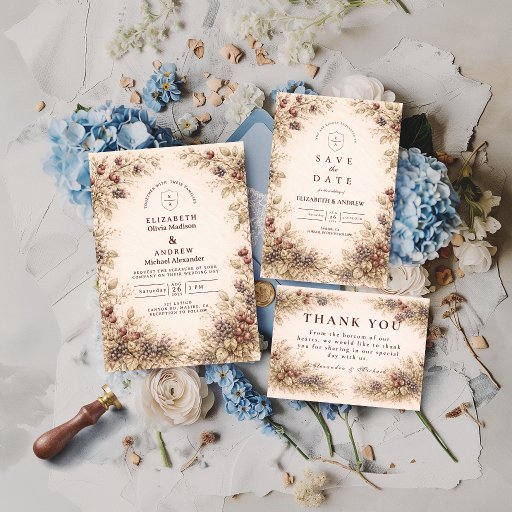 A softly detailed vintage design featuring delicate berries, foliage, and muted botanical elements arranged in a romantic natural frame. The earthy tones and subtle textures create a warm, organic atmosphere with a hint of rustic charm. Perfect for countryside, garden, or autumn-inspired celebrations, this design blends timeless elegance with a gentle, nature-driven aesthetic that feels both intimate and refined.