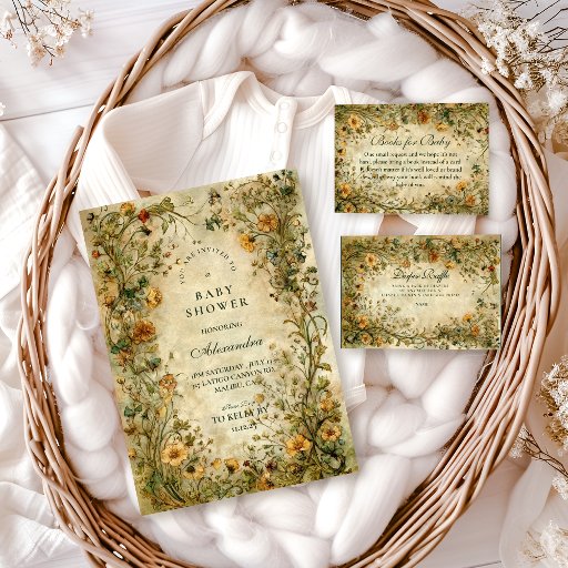 This baby shower design features a romantic wildflower frame with soft greenery, delicate florals, and an antique parchment background. The illustration style feels whimsical yet timeless, inspired by vintage botanical prints and storybook garden aesthetics.