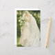 This image portrays an elegant bride standing gracefully in a lush, sunlit garden. She wears an ivory wedding gown adorned with delicate lace, subtle beading, and a softly gathered waist accentuated by a jeweled brooch. A long, translucent veil cascades behind her, catching the light and adding a sense of movement and ethereal beauty. The bride gazes gently downward at a cascading bouquet of white lilies and greenery, her expression calm and contemplative. Surrounded by dense foliage and tall trees rendered in soft, painterly tones, the scene evokes a romantic, timeless atmosphere inspired by classical illustration and Art Nouveau aesthetics.