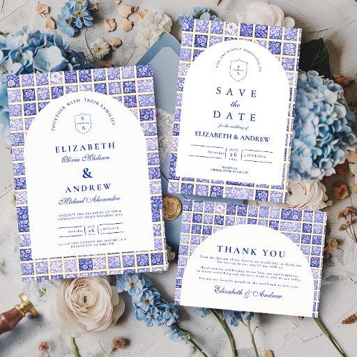 A timeless blue and white design inspired by classic Delft porcelain and French toile patterns. The patchwork tile border combines delicate florals, stripes, and ornamental motifs that evoke vintage European ceramics. A soft arched panel in the center keeps the layout refined and elegant while allowing the details of the porcelain-inspired pattern to frame the celebration beautifully. Perfect for couples planning a sophisticated blue and white wedding with traditional European charm.