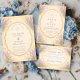 A romantic vintage wedding design inspired by classic European garden stationery. Soft watercolor lavender blooms frame an elegant scalloped label, set against a warm parchment background with delicate botanical accents. The refined typography and antique-inspired border create a timeless, heirloom aesthetic reminiscent of countryside weddings in Provence, perfect for couples who love elegant botanical details and vintage charm.