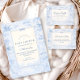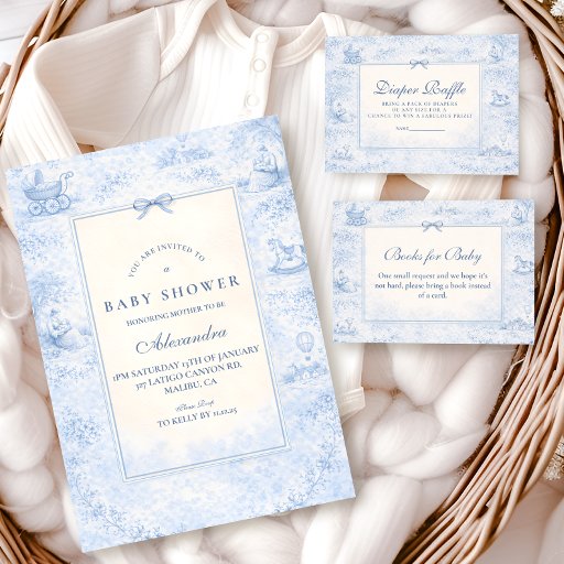 A classic powder-blue toile design inspired by traditional French countryside prints. Vintage nursery motifs — pram, rocking horse, lamb, pastoral village scenes and delicate ornamental borders — frame a clean, structured central layout. The soft ivory background paired with refined blue linework creates a timeless and sophisticated look. Perfect for a traditional baby shower with an elegant European aesthetic.