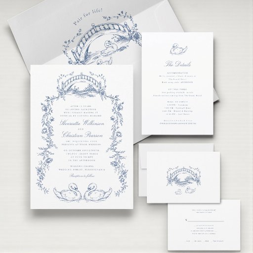 Embrace timeless romance with this enchanting blue toile swans and garden wedding response card. The delicate sketch features a picturesque bridge, serene swans on the water, and whimsical floral vines, creating a charming and idyllic scene. This design is ideal for couples planning a garden wedding, a waterfront celebration, or a fairytale-themed event. The intricate blue illustration adds a touch of artistic flair and vintage appeal, ensuring your response cards are as memorable as your invitations. Let this beautiful piece of art guide your guests in responding to your joyous occasion.