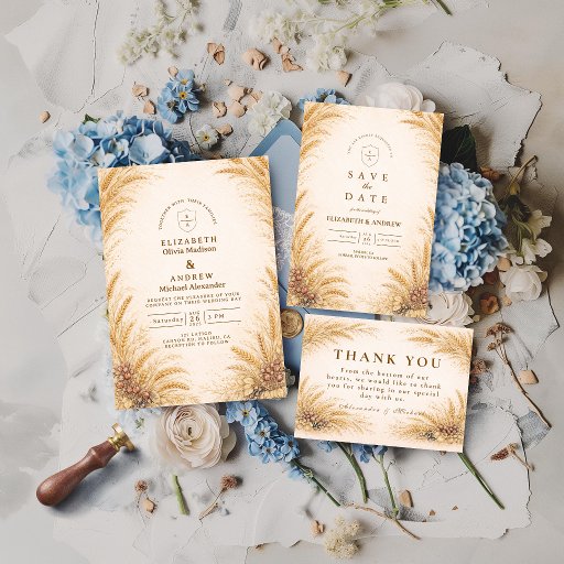 A warm and refined design inspired by golden wheat fields and late summer countryside landscapes. Delicate wheat stems and soft botanical accents frame the composition, creating a natural, organic look with timeless appeal. The muted earthy palette and airy layout evoke a sense of calm, simplicity, and understated elegance—perfect for rustic, countryside, or harvest-inspired celebrations with a sophisticated touch.