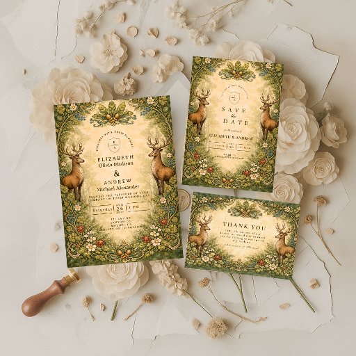 A charming woodland wedding design inspired by storybook forests and nature romance. Illustrated pine trees, woodland animals, birds, florals, and soft earthy tones create a warm, enchanting atmosphere that feels intimate and timeless. Perfect for forest weddings, outdoor ceremonies, mountain venues, or nature-loving couples. Text is fully customizable to reflect your special day.